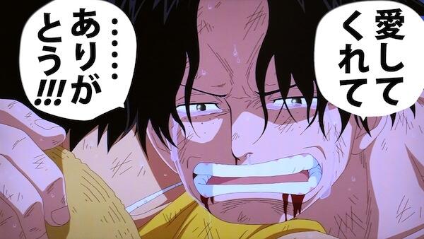アニメ マジ泣きした名言 心に残る名言 Na Twitterze ワンピース エース死す もう みんなに届くような声は出せねぇ オヤジ みんな そしてルフィ 今日までこんなどうしようもねェ このおれを 鬼の血を引くこのおれを 愛してくれて ありがとう T